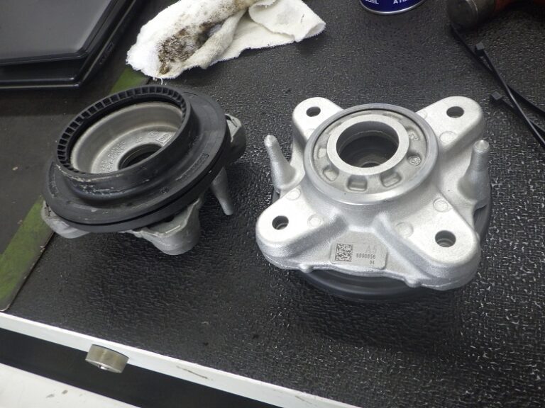 作業しております。今回は、車両の走行距離が5万キロ超えていたので同時にアッパーマウント前後の交換をしました。