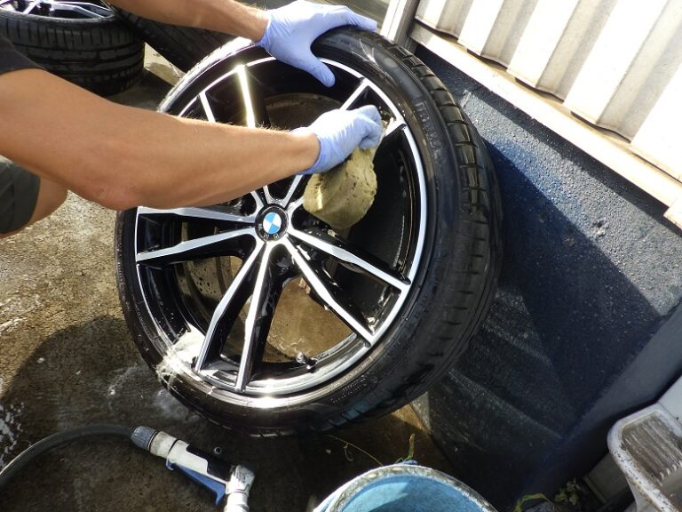 ハブ部分錆取り、防錆処理を行いホイールは、裏も表も洗います。この内容は、当店の車検整備の基本価格に