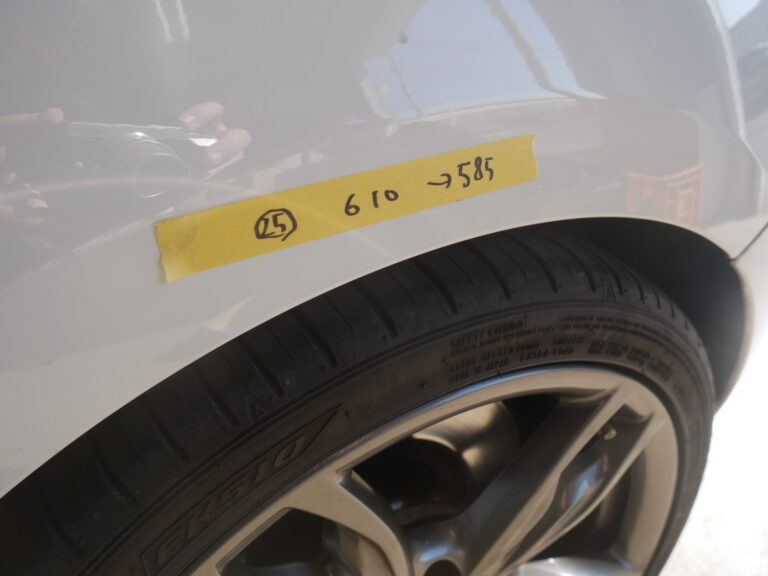 取り付け後にローダウン量を計測したところ前後とも25mm程度ローダウンしました。