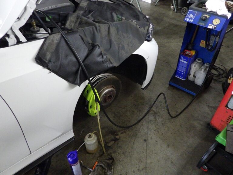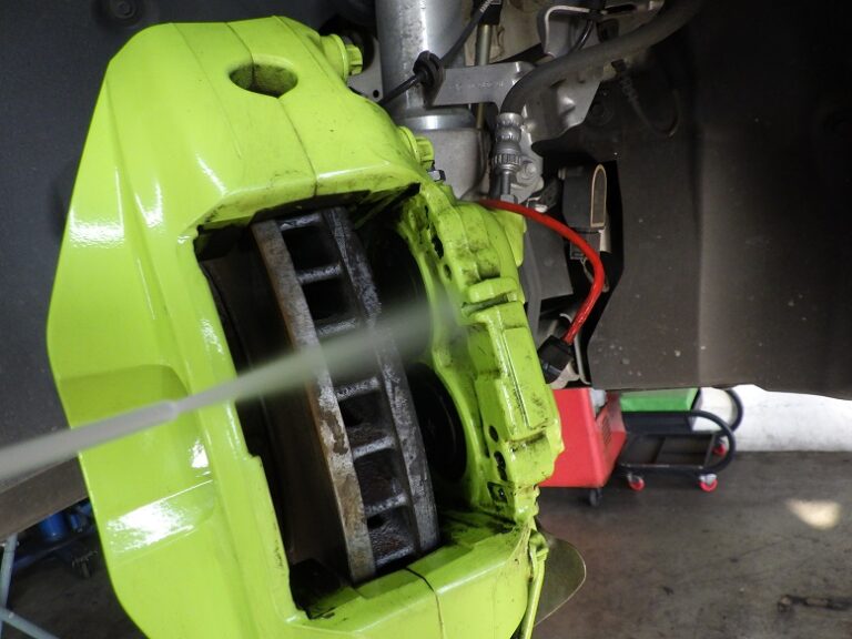 当店の車検整備においては、ブレーキまわりの洗浄とキャリパーシールからのフルード滲み点検をして