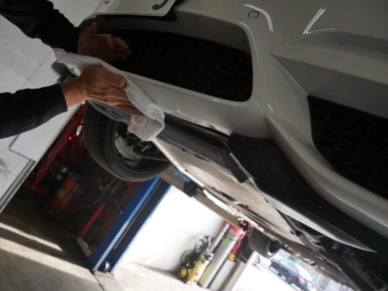 友締め、そして左右2か所バンパー底面に穴あけしてボルト、ナットで固定します。