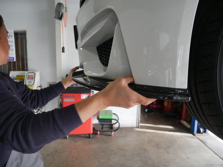 取り付け時には、スポイラーを仮合わせして取り付け位置決めを行い両面テープ貼り付けとバンパー固定のビスと