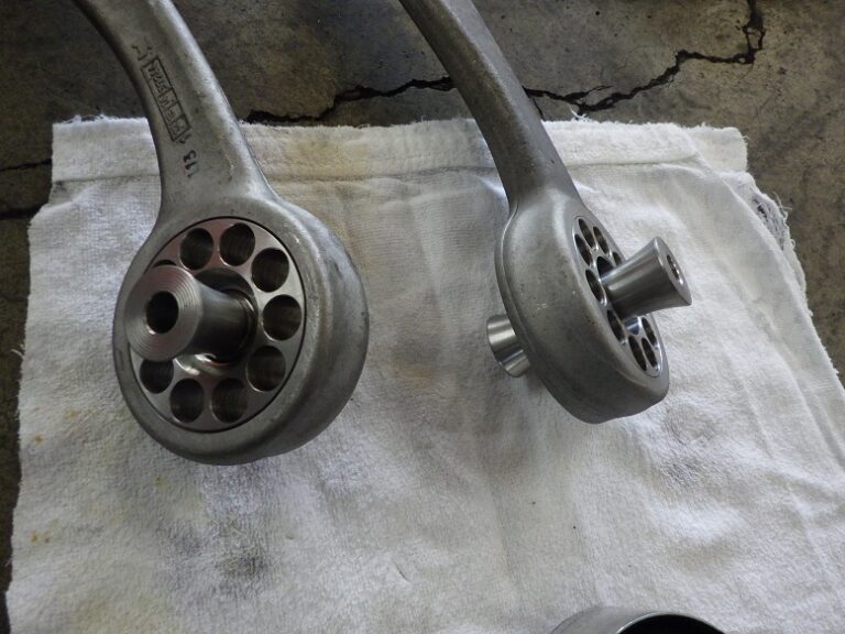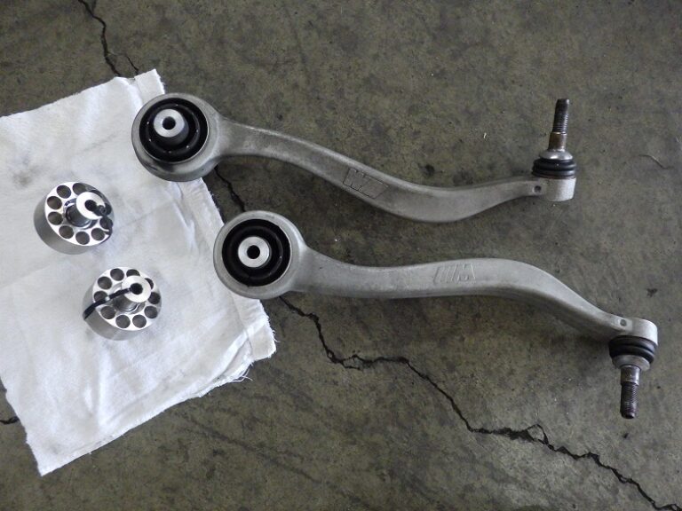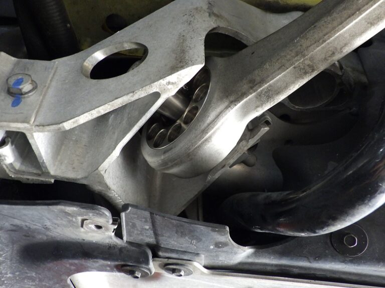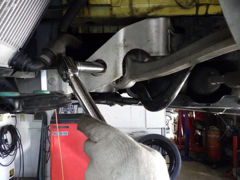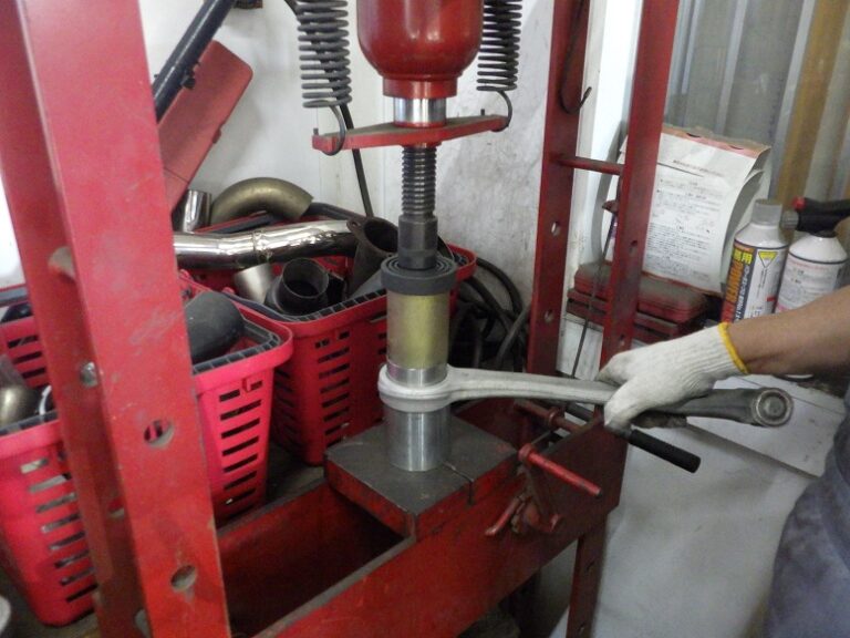写真のようにアームを取り外してブッシュを圧入で交換をします。アーム取り付け時には、規定トルクでトルクレンチを