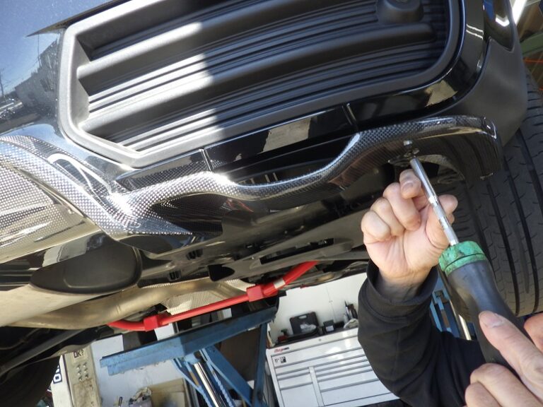 取り付けをします。リアディフューザーは、車両側のビスと取り付けとバンパー底面に穴あけをして