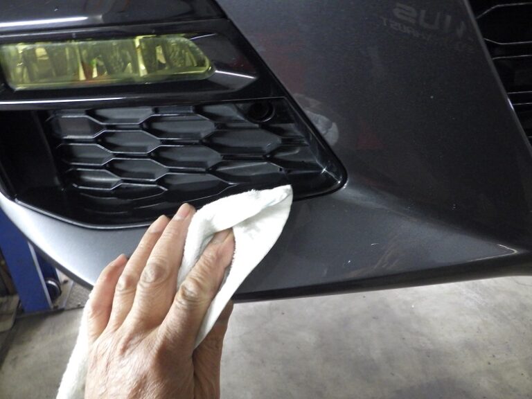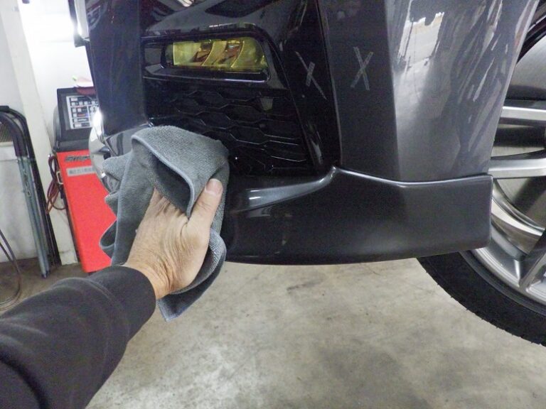 取り付け面の脱脂をしっかり行い両面テープとバンパー底面に穴あけをしてビス止めにて取り付けします。