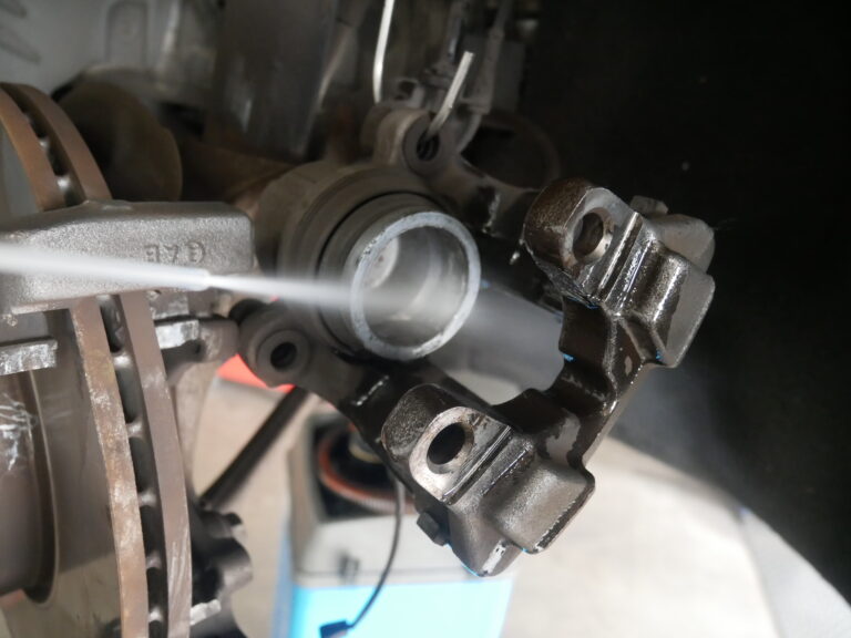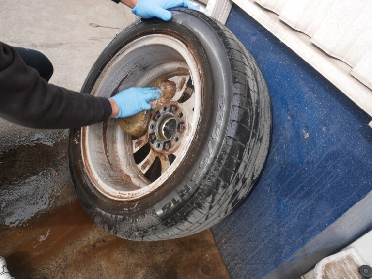 キャリパーシールからのフルード滲みの点検を行いブレーキキャリパーを洗浄してホイールは、裏も表も綺麗に洗います