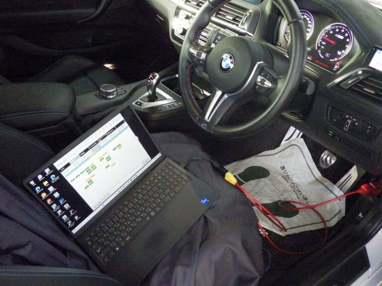 最後にBMW専用テスターを車両に接続してコンピューター診断を行いエラーチェック、消去、