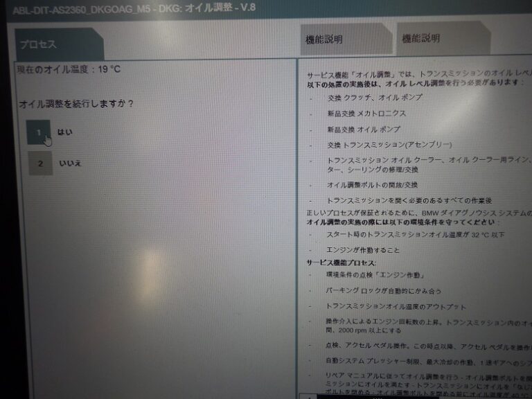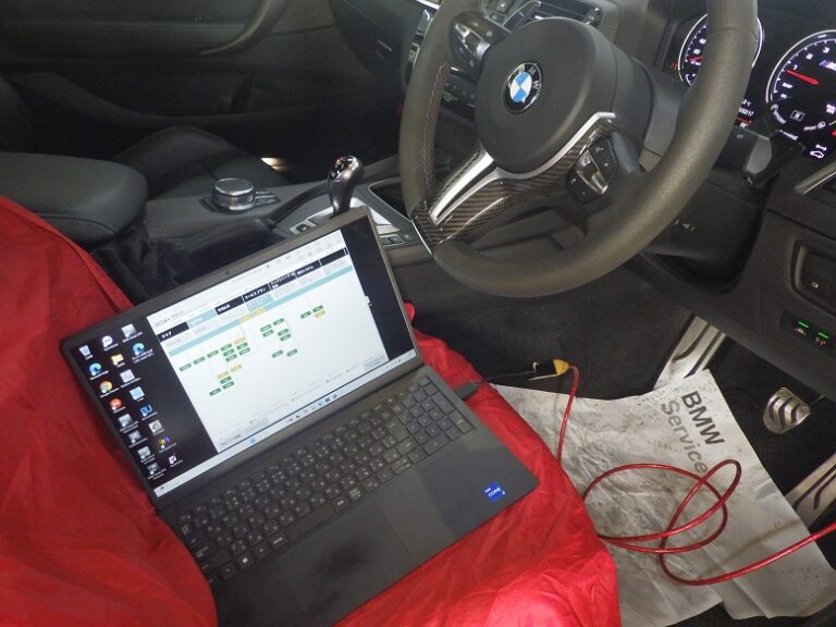 最後にBMW専用テスターを車両に接続してコンピューター診断を行いエラーチェック、消去、サービスインターバルリセット