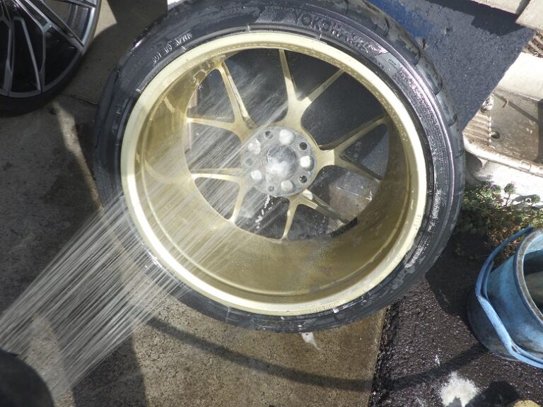 タイヤ交換が完成したらホイールの裏も表も綺麗に洗いハブ部分の錆取り防錆処理を行いエア調整をして
